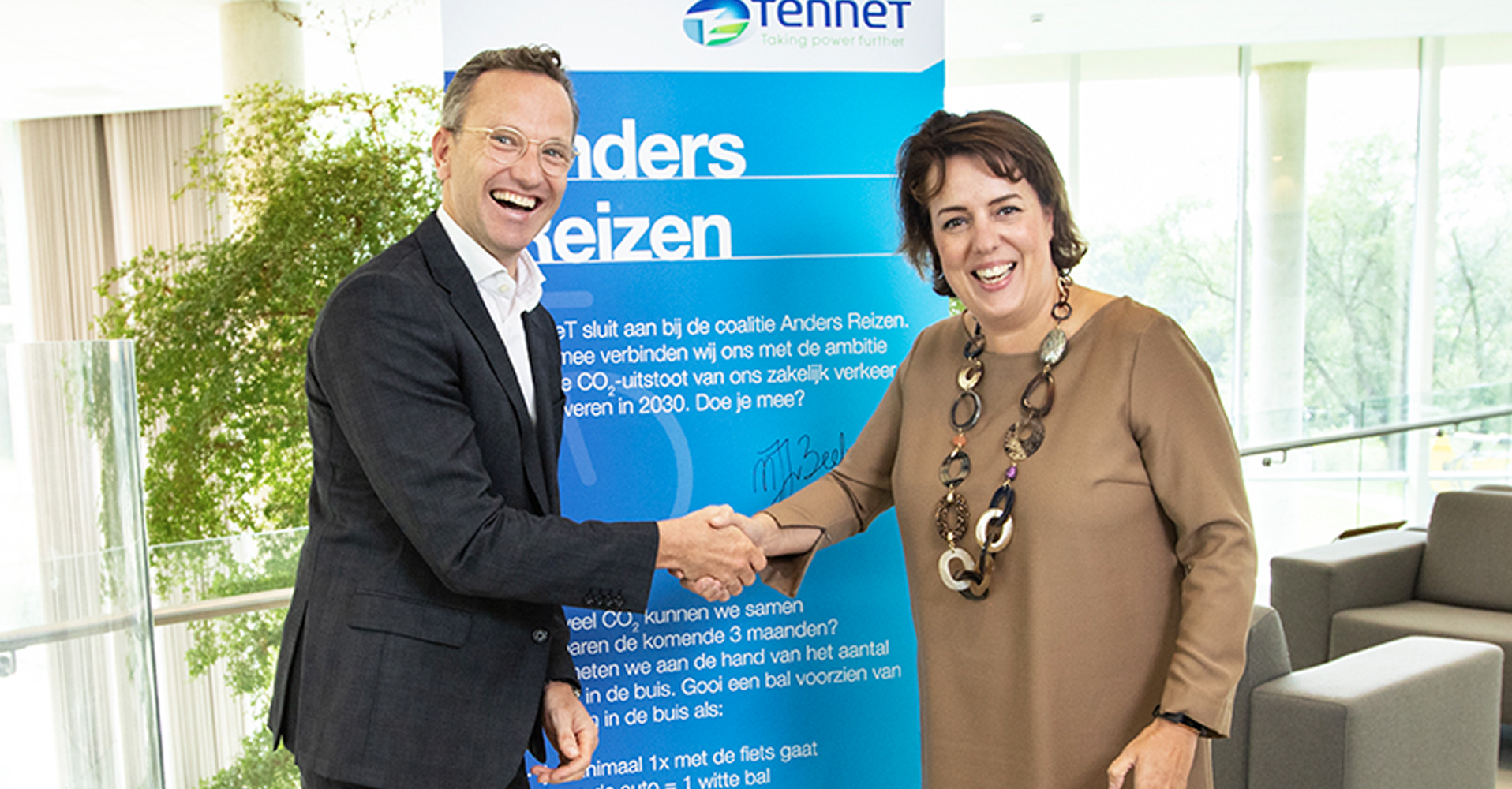 Trots zette Manon van Beek haar handtekening op een manshoge banner in aanwezigheid van Hugo Houppermans, directeur programma Anders Reizen en haar collega’s. Hiermee beklonk de CEO van TenneT de aansluiting van haar energiebedrijf bij de coalitie Anders Reizen op donderdag 5 september. Net als de andere bedrijven die zijn aangesloten bij het werkgevers netwerk, zal TenneT de CO2-uitstoot van haar zakelijke mobiliteit met 50% terugbrengen voor 2030.